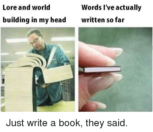 You see, I have a lot of ingrained self esteem problems anyway. I have this grandiose idea for a book trilogy, I’ve got the main character biographies done, the world building is coming along nicely.
